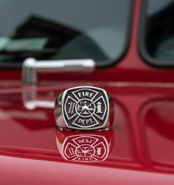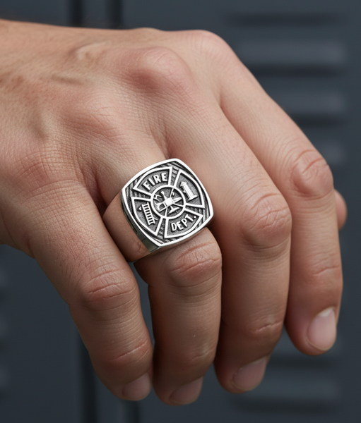 This Unisex Fireman's Ring in Stainless Steel. The Black Firefighter's Maltese Cross has many features. the words "FIRE" and "DEPT", a Fire Hydrant, a Ladder and a Helmet are within the Maltese Cross shape. The Black Background really shows off all this Detail. The Rounded Square top measures 20 x 20mm and forged of a single piece of 316L Stainless Steel. This 1st Responder Ring is Extremely Durable. No matter whether you are a Volunteer Firefighter or The Chief and for anyone who ranks in between! This Firefighter Ring is a Bold Way to Showcase your Commitment to Your Company