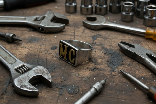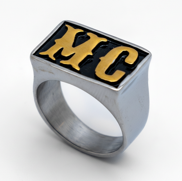 The Gold Edition "MC" Signet Ring Features Raised Gold-Plated Letters set against a Sleek Inlaid Black Enameled Background, All Crafted from High-Polished Stainless Steel. Make a Bold Statement and Show Off Your Club Identity with this Authentic Biker Stainless Steel.
