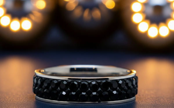 This Snazzy Stainless-Steel Band Flaunts Two Dazzling Rows of Cut Black Ice Crystals, adding just the Right Sprinkle of Sparkle—like it Dressed Up for a Party and never left. With its Comfort-Fit Band, you can Wear it All Day. Perfect for a Wedding Band or just to Make your Other Rings Jealous.