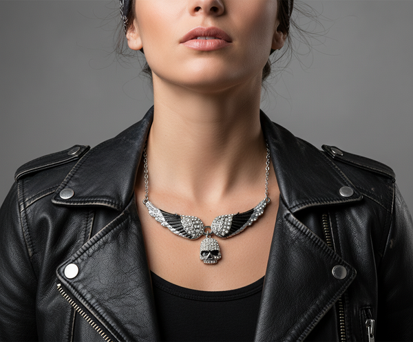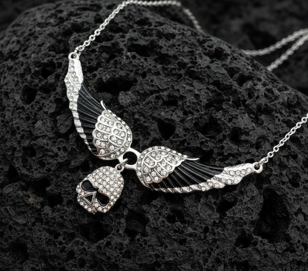 A beautifully intricate angel wing with dangling Willie G skull pendant necklace made of the highest quality durable stainless steel. Painted black imitation crystals for that added bling, on a 17- 19-inch adjustable chain, with a 3¼ inch wide wingspan. Made by Heavy Metal Jewelry.