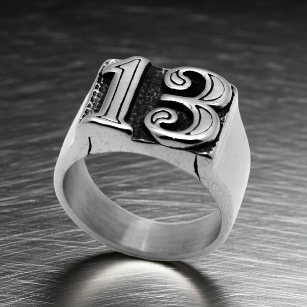 Number "13" Biker Ring boasts a 15mm x 19mm Square Top and a Wide Shank that Hugs your Finger tighter than your favorite leather jacket. The High-Polished Stainless Steel proudly flaunts its Bold "13" against a Sleek Black Enameled Background.