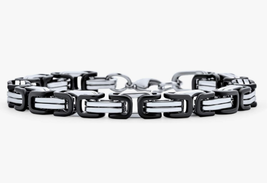 Unisex two-tone bracelet black and high polished stainless steel byzantine bracelet a super looking piece. A great width being 7mm x 7mm, this bracelet can be worn every day. Looking for a larger version, we carry that as well.