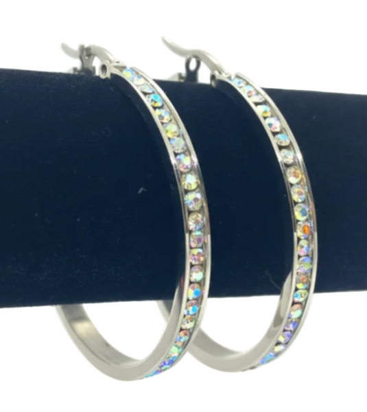 Two sizes to choose from 30mm or 40mm hoop earrings, all channel set crystal all in pink and channel shinning though, about 2.5mm wide. Easy to put on and off. Made with clean 316L stainless steel so they are safe to wear.