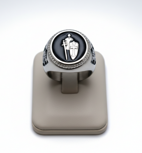 The Armor of God Signet Ring Two Tone Design Showcases a Raised Silver Shield and Sword set against Sleek Black Enamel Inlay. Its Intricate Design Pops it continues with “Return with Honor” on one side and “Pray Always” on the other. This Bold, Weighty Men’s Ring Blends Powerful Symbolism with Striking Style.