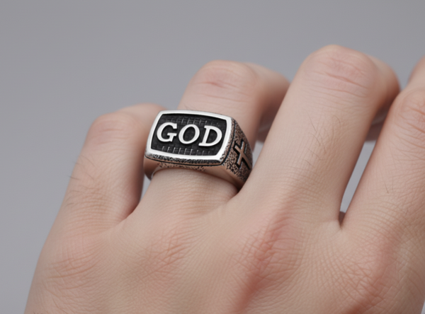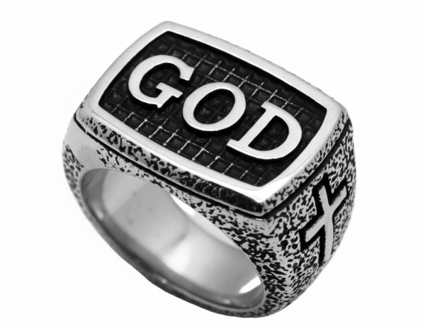 The "GOD" Signet Ring Flaunts HIS Name in Bold, Raised Letters against a Sleek Black Background, with a Cross on each side Acting like Tiny Bouncers for the Almighty. Crafted from Stainless Steel, it has the Heft and Toughness of something Built to Survive Apocalyptic Throw Downs.