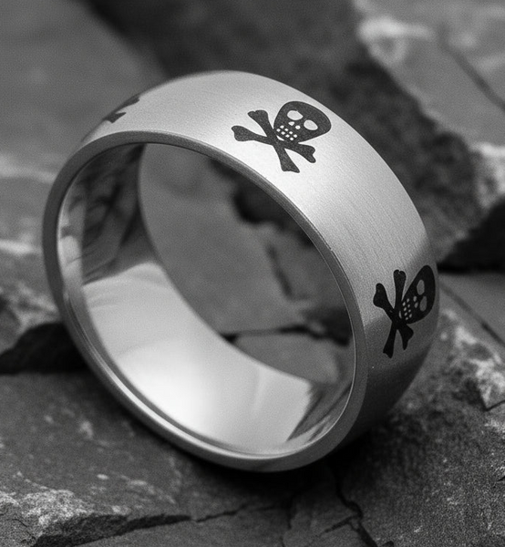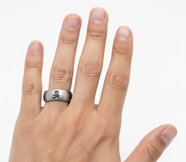 This Sleek and Stylish Ring or Wedding Band Shouts "Till Death Do Us Part" with Attitude, Showcasing Black Skulls and Crossbones Encircling on a Brushed Satin Finish. Crafted from Durable Stainless Steel 7.5mm of the Ideal Blend of Boldness and Style, serving up Major Edgy Vibes while keeping the look Effortlessly Cool.