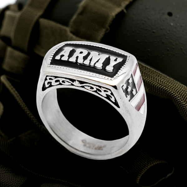This Military Ring is a Must-Have for any Army Service Member, whether they're Active Duty or a Retired Veteran. It's the Ultimate Bling to Show off your Dedication to your unit and your Love for your Country—because nothing says "I Serve with Pride" like a Shiny Piece of Metal! Featuring a Bold Enameled Red, White, and Blue U.S.A. Flag on one side and Lettering "USA" on the other. The "ARMY" Lettering is raised on an Inlaid Black Enameled Background and Screams Patriotism. Available in sizes for both Men and Women, it's made of solid 316L High Polished Stainless Steel, so it's Tougher than your Drill Sergeant. Give this Ring as a Gift and watch your Favorite Service Member Salute you in Appreciation! The Dimensions of this ring increase as the finger size increases from (size 5) 10 x 16mm tall & wide. Up to (size 15) 14 x 22mm tall & wide.
